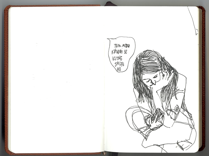 The mobile phone is surely the lifeline of commuters everywhere. Here’s a girl gossiping on the phone while her neighbor is engrossed in eating a bhutta (corn) even though eating is not allowed on the Metro.