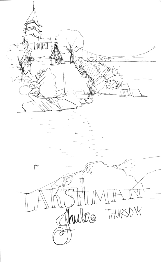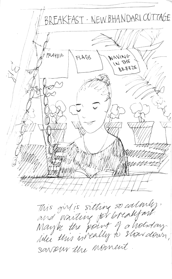 Awesome! Your sketches & narrative were like time machines! In the middle of another contract-day, loved the perspective on how not to do. Thank you so much for sharing. Btw the three figures opp the photographer, the ‘prayer flags waving in the breeze’ and the raised hand from the hammock were my fav captures!