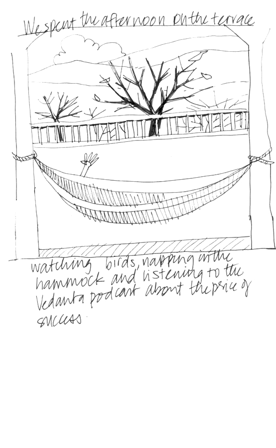 When we were not drawing people at the ghats, we spent time on the terrace of the hotel, watched birds, napped in the hammock, and listened to the Vedanta podcast about the price of success.