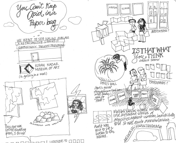 Next was a group show called Is That What You Think. Some of the pieces were interesting – because you really could figure out the narrative behind the artwork if you try. Like the piece by Vivan Sundaram which didn’t make sense at a cursory glance, but as I moved around the room I really began to open up to the feelings that the artist might have wanted to express. One – a piece of video art showing rolling waves was a transporting experience though I didn’t really understand it. Lightning Testimonies was an interesting way to watch the films, and that’s not the least of it. (And by the way if you want to see the drawing larger just double click on it – and then remember to return to this post!)