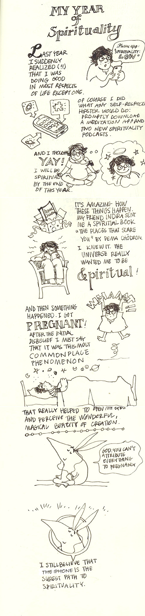 {Last year I suddenly realized that I was doing well in most respects of life except one. Of course I did what any self-respecting hipster would do: promptly download a meditation app and a couple of spirituality podcasts. And I thought: Yay! I will be spiritual by the end of the year. It’s amazing how these things happen – my friend Indira sent me a spirituality book out of the blue. “The Places That Scare You” by Pema Chödrön. I knew it! The universe really wanted me to be spiritual! And then something happened. I got pregnant! After the initial disbelief, I must say that it was this most commonplace phenomenon that really helped to open my eyes and perceive the wonderful, magical, beauty of creation. Anteater: God you can’t attribute everything to pregnancy – I still believe that the iPhone is the surest path to spirituality.”}