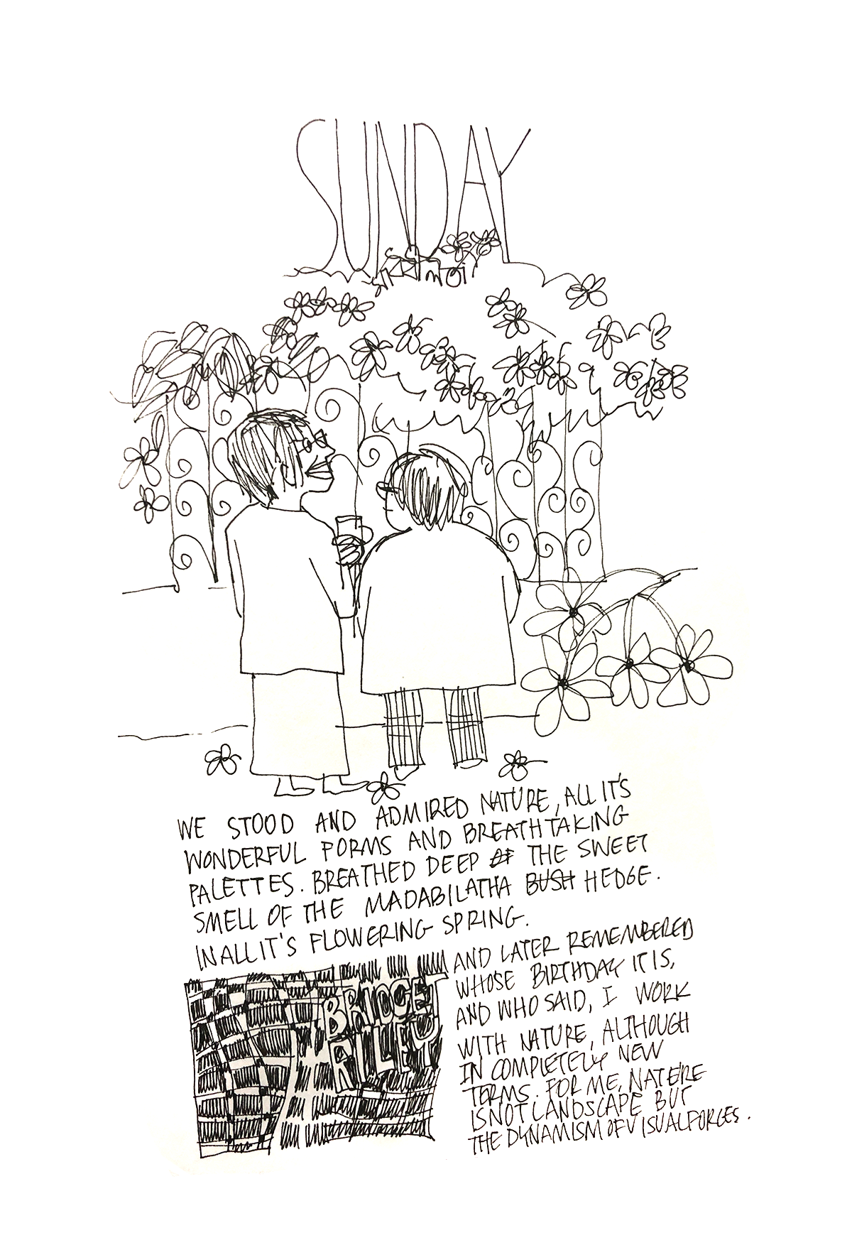 [We stood and admired nature in all it’s wonderful forms and breathtaking palettes. Breathed deeo the sweet smell of the madhabilata hedge in all its flowering spring. And later remembered Bridget Riley, whose birthday it is, and who said,
