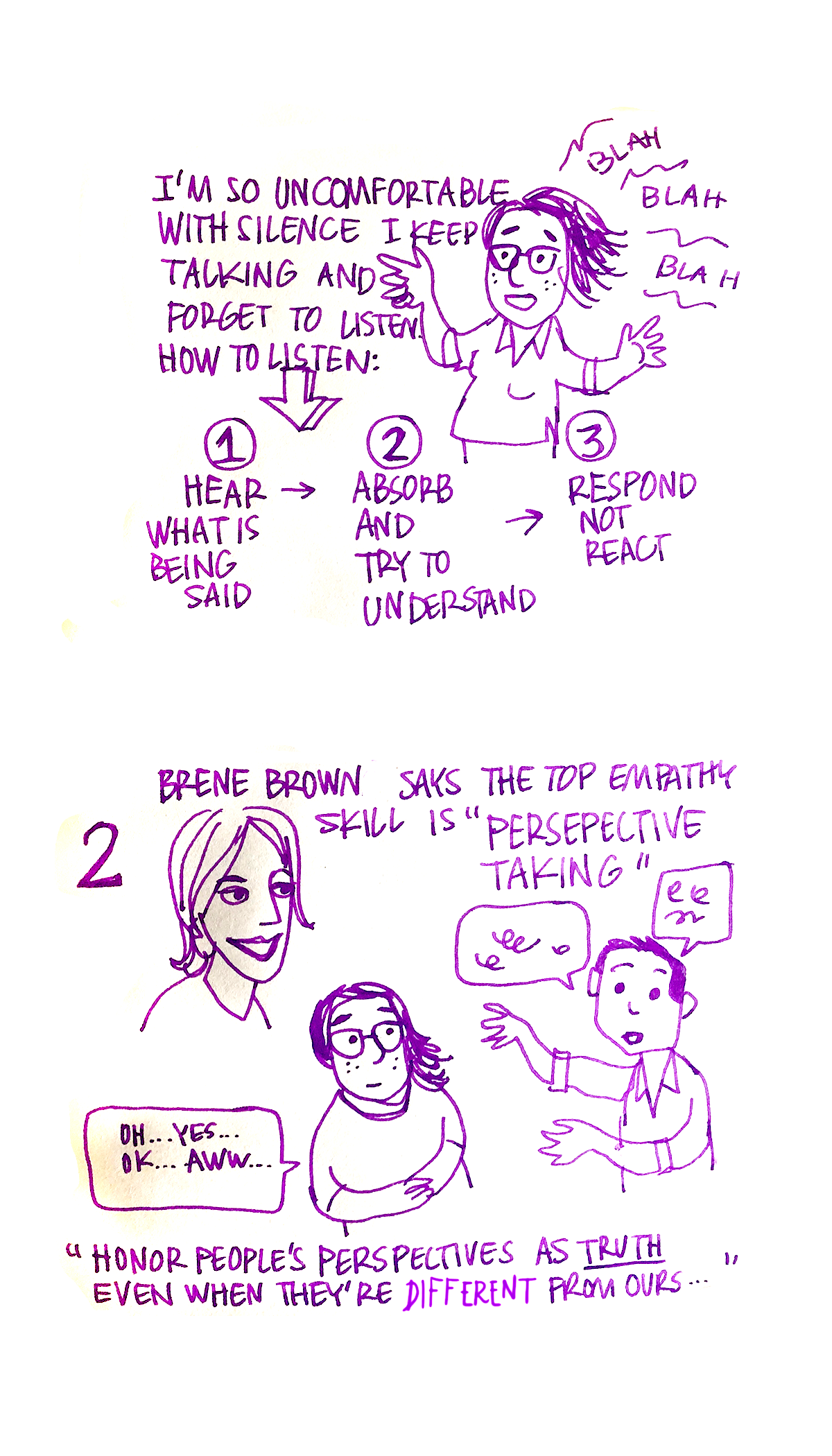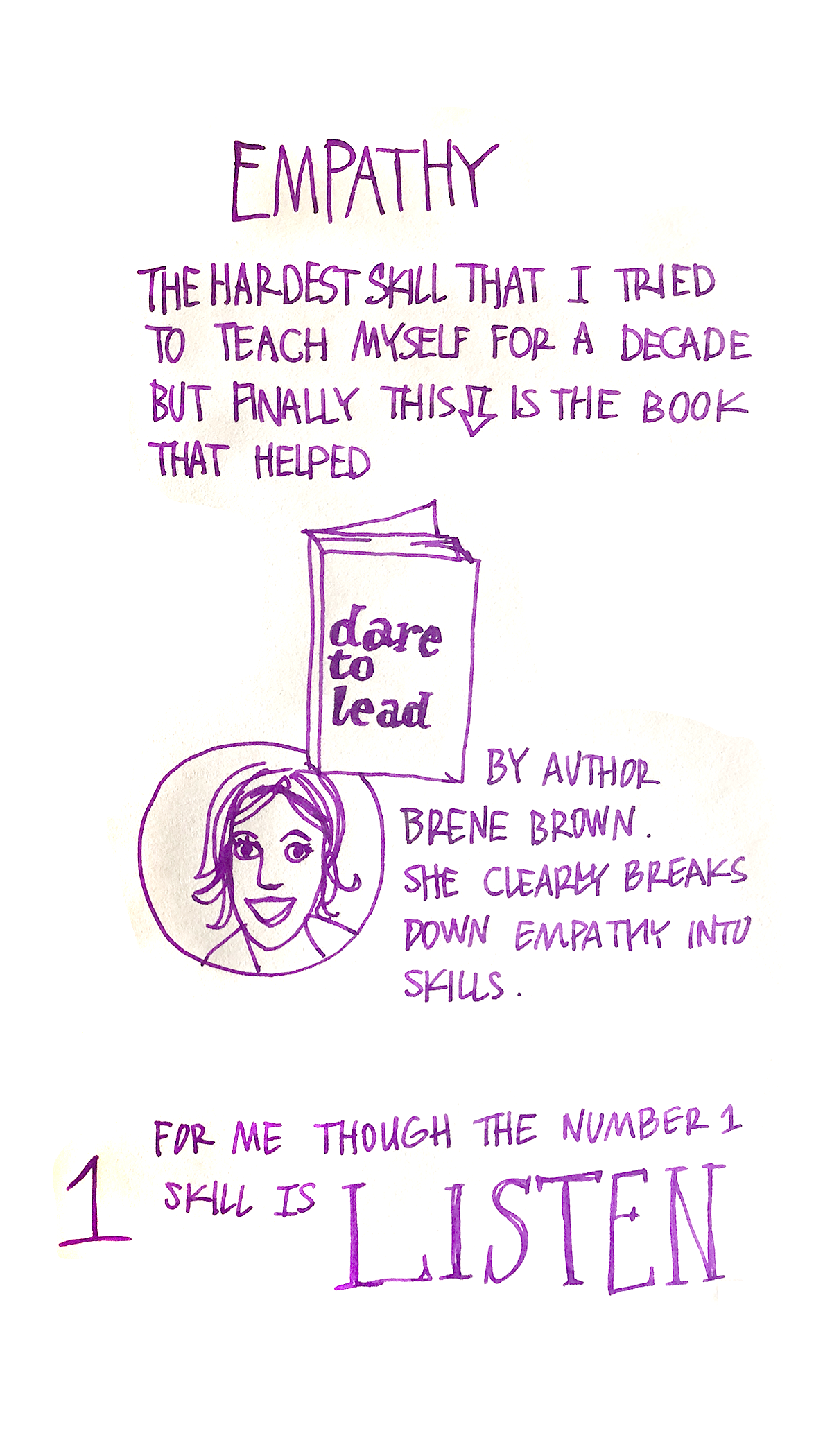 [Empathy The hardest skill that I tried to teach myself for a decade but finally this is the book that helped, Dare to Lead by author Brene Brown. She clearly breaks down empathy into skills. For me though the number 1 skill is to Listen. I’m so uncomfortable with silence I keep talking and forget to listen. How to listen: 1 – Hear what is being said 2 – Absorb and try to understand 3 – Respond not react