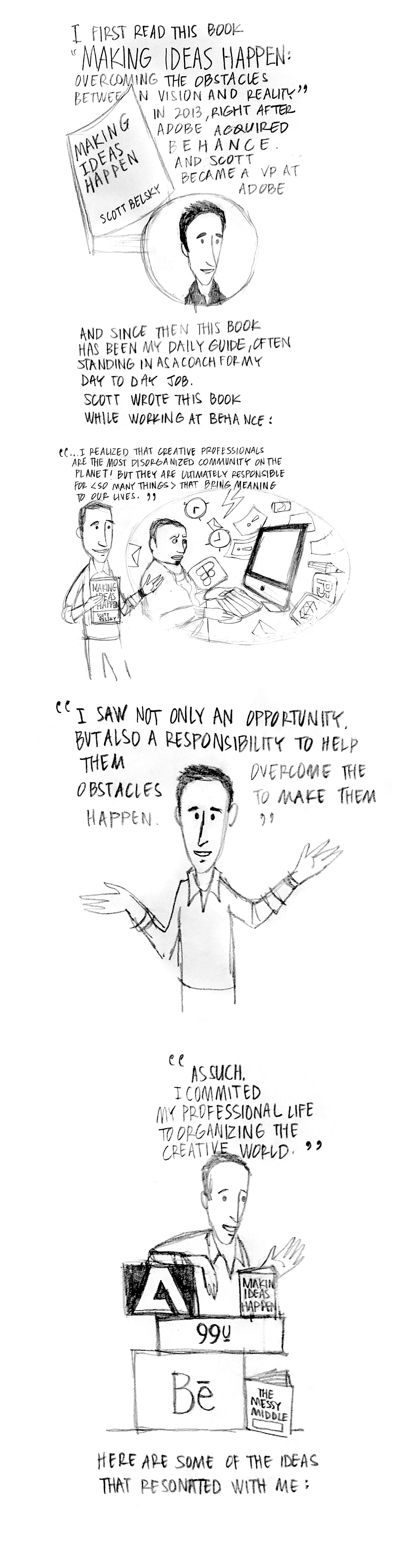 [I first read this book Making ideas happen: Overcoming the obstacles between vision and reality in 2013, and since then this book has been my daily guide, often standing in as a coach for my day job. Scott wrote this book while working at Behance: “I realized that creative professionals are the most disorganized community on the planet! But they are ultimately responsible for <so many things> that bring meaning to our lives…