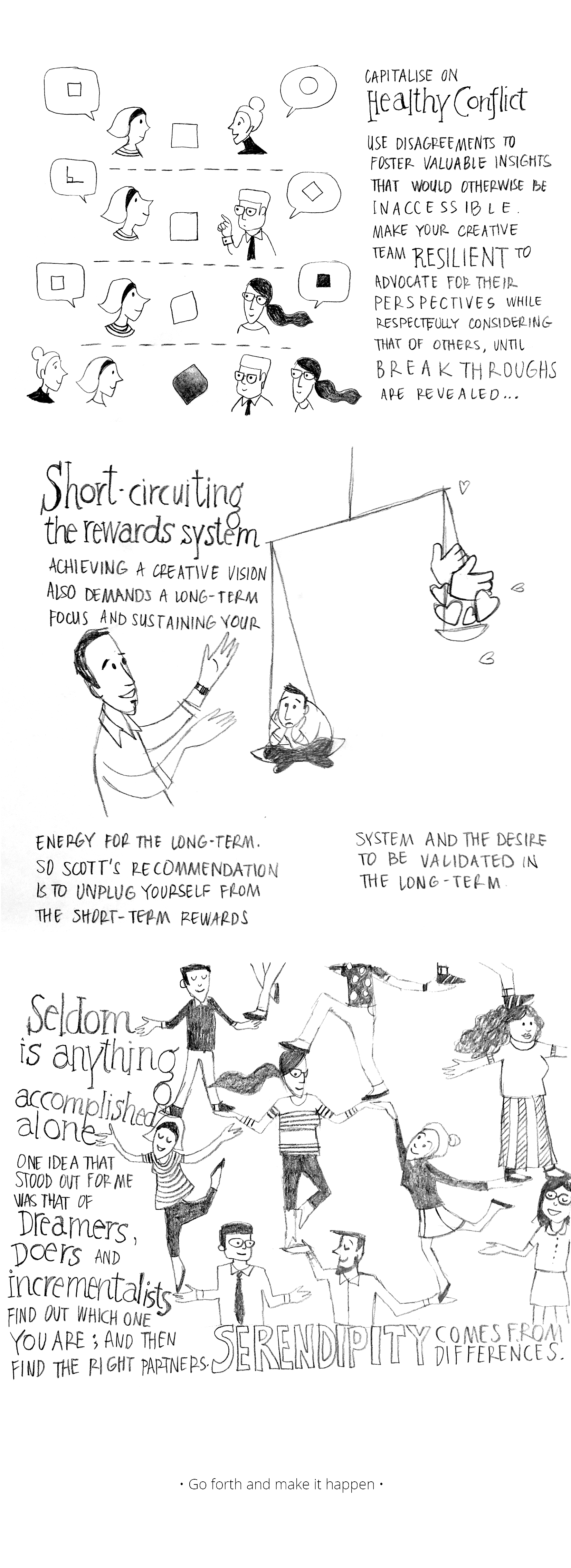 Seldom is anything accomplished alone: One idea that stood out for me was that of Dreamers, Doers and Incrementalists. Find out which one you are, and then find the right partners. Serendipity comes from differences.]