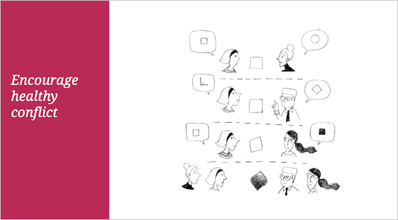 Capitalize on healthy conflict: Use disagreements to foster valuable insights that would otherwise be inaccessible. Make your creative team resilient to advocate for their perspectives while respectfully considering that of others, until breakthroughs are revealed.