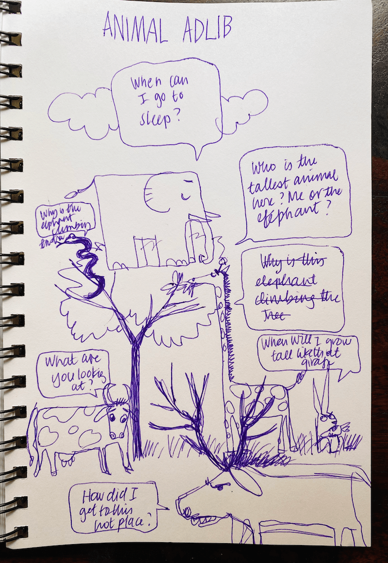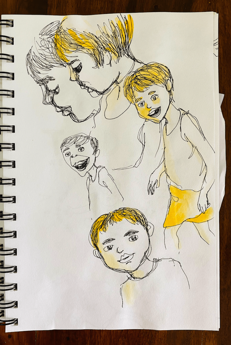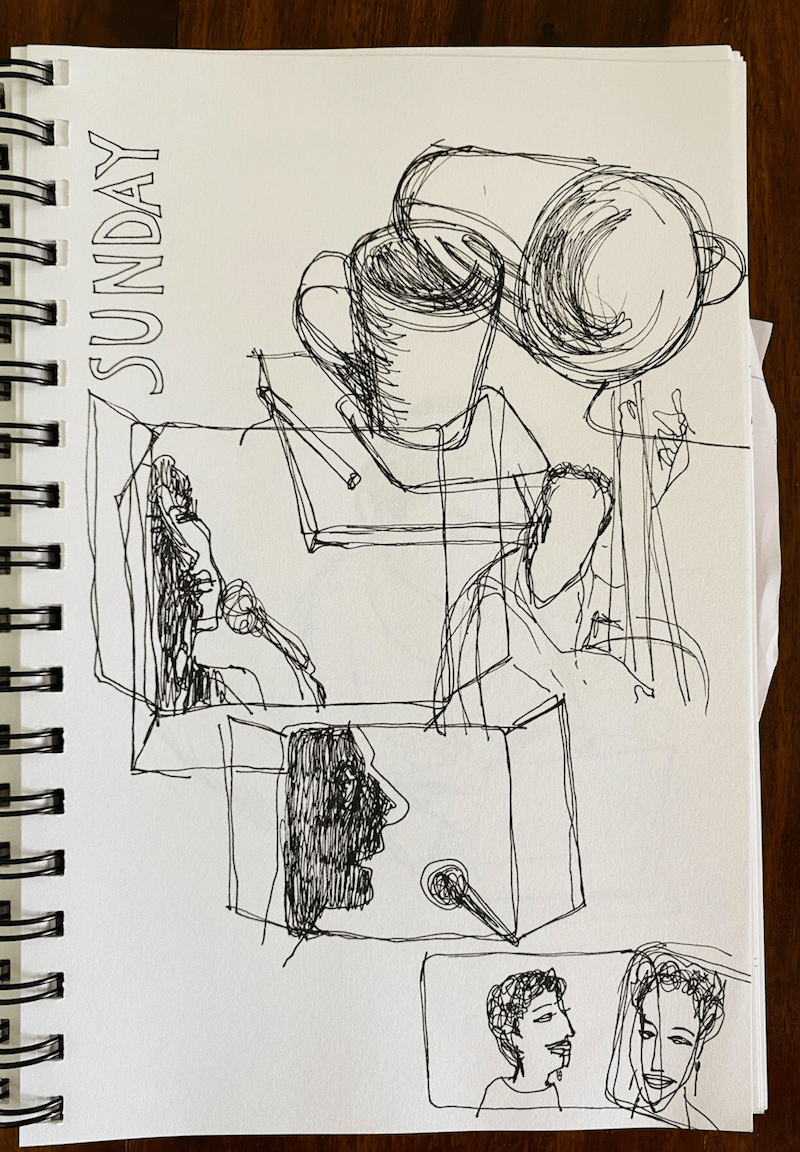 This video and the earlier one are how my day-to-day journal drawing takes place. I sit down with my book and try to draw what’s on my mind. Sometimes I start by drawing what’s in front of me – which is why there are so many drawings of Orin eating! At other times I draw the day, how things went, what I listened to, or read. Sometimes my mind is blank and quite often the fear of the empty page threatens to take over.