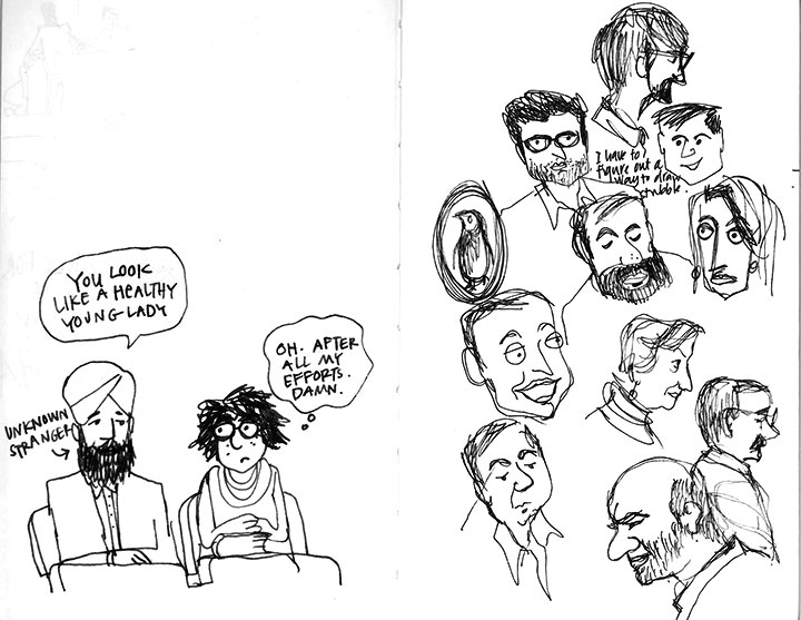 I think it was October (?) that I happened to go to the book launch of Gandhi before India by Ram Guha. Until the session began, I amused myself by drawing the people in the audience. If any of you reading this post go to book launches, please don’t stop – I love drawing faces of book lovers – a refreshing change from the blue line Delhi metro commuters.