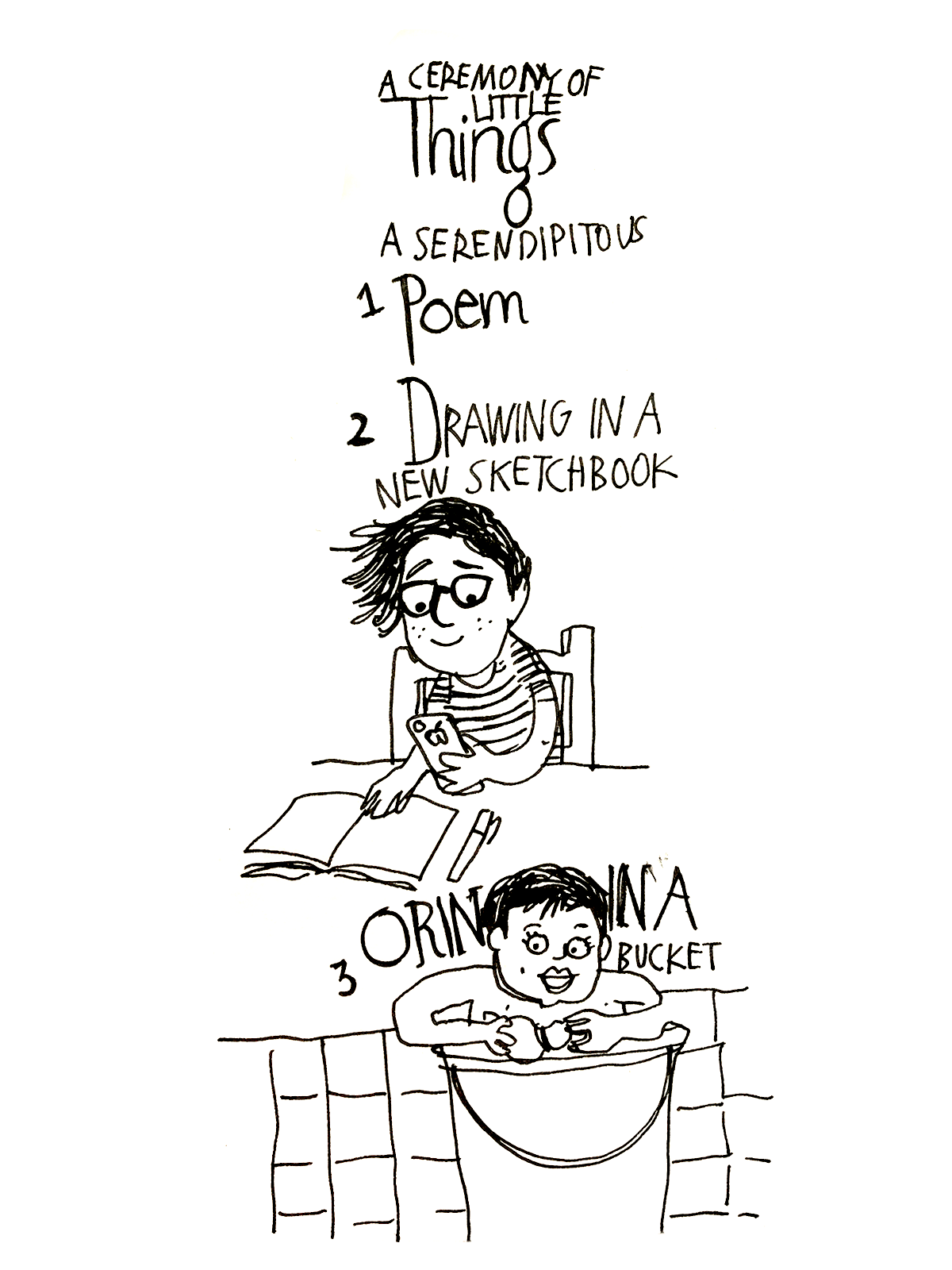 A serendipitous poem, drawing in a new sketchbook, Orin in a bucket. Sigh.