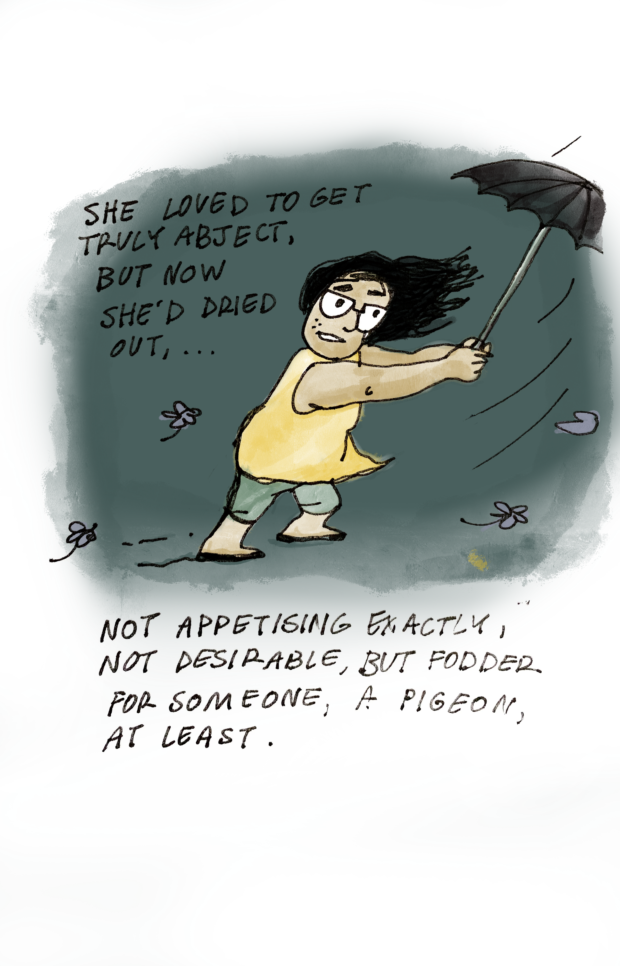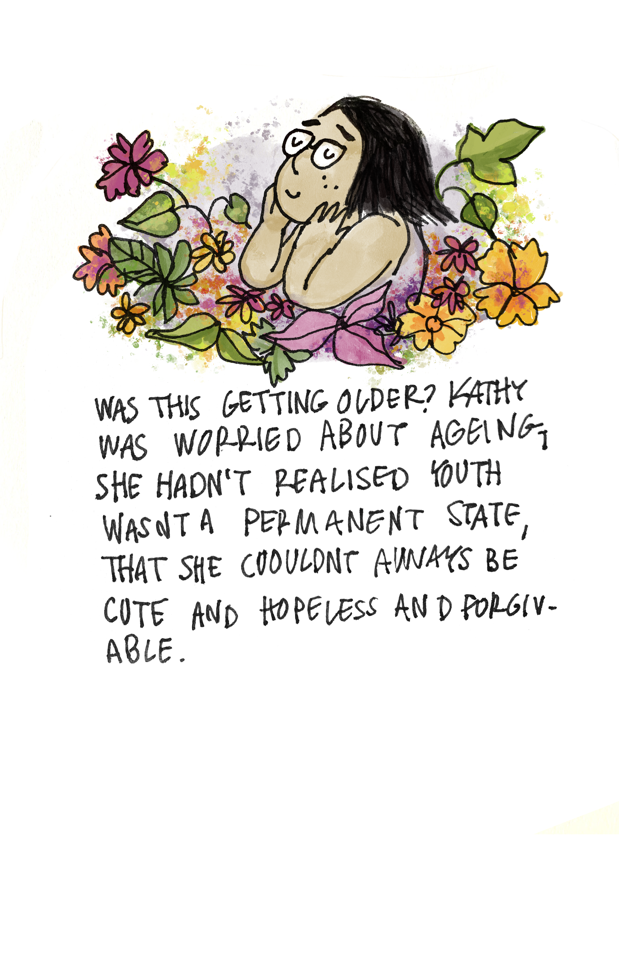 “When she was young, she’d sliced up her own flesh at the blink of an eye, she loved to get truly abject, but now she’d dried out…not appetising exactly, not desirable, but fodder for someone, a pigeon, at least. Was this getting older? Kathy was worried about ageing, she hadn’t realised youth wasn’t a permanent state, that she couldn’t always be cute and hopeless and forgivable.”